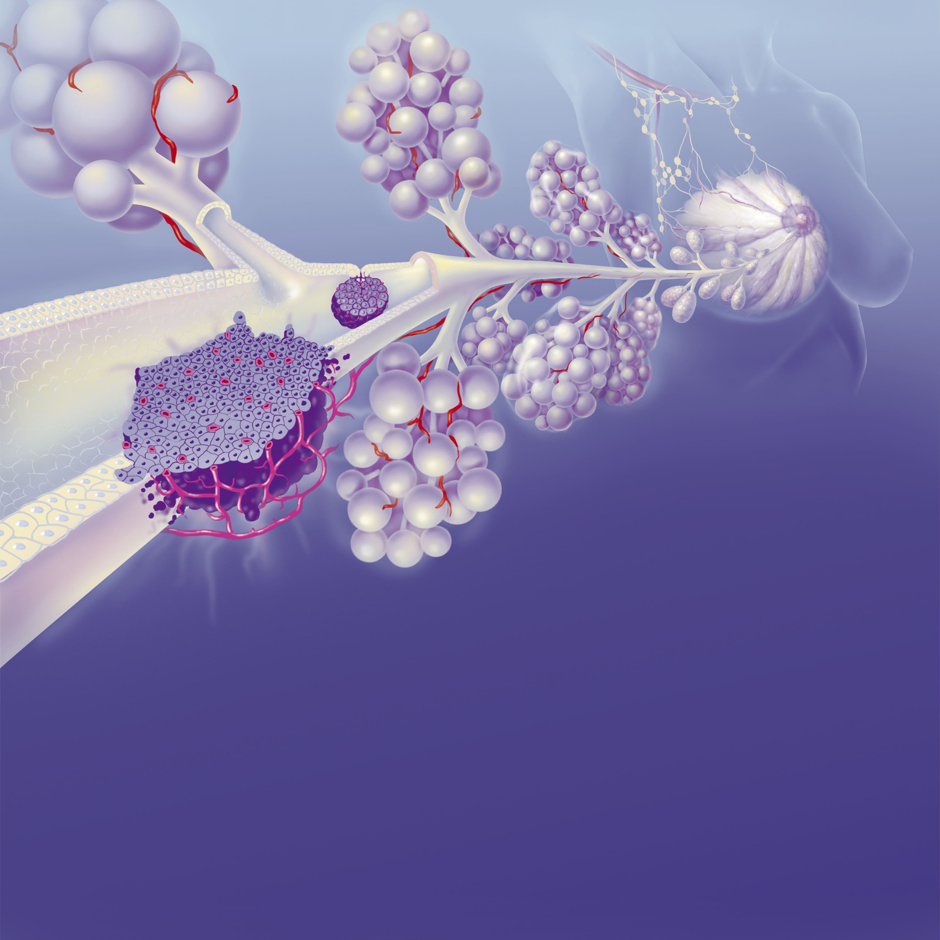 Medical illustration showing invasive and in situ ductal carcinomas. The image traces a zoom from the mammary gland to the milk duct, highlighting tumor locations, glandular structure, and axillary lymph nodes | Source: Getty Images