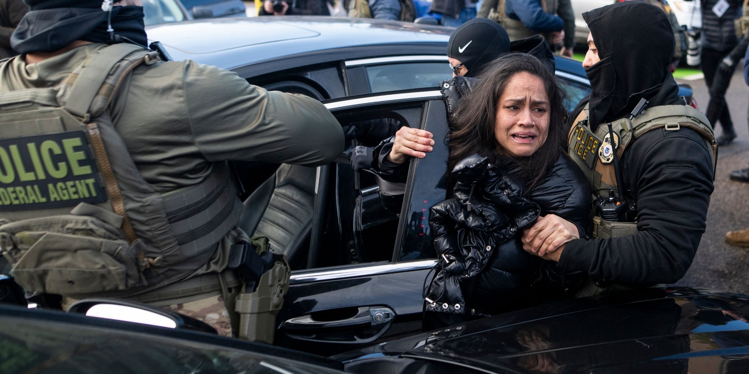 ICE agents pull a woman from a car before detaining her on January 13, 2026 in Minneapolis, Minnesota. | Source: Getty Images