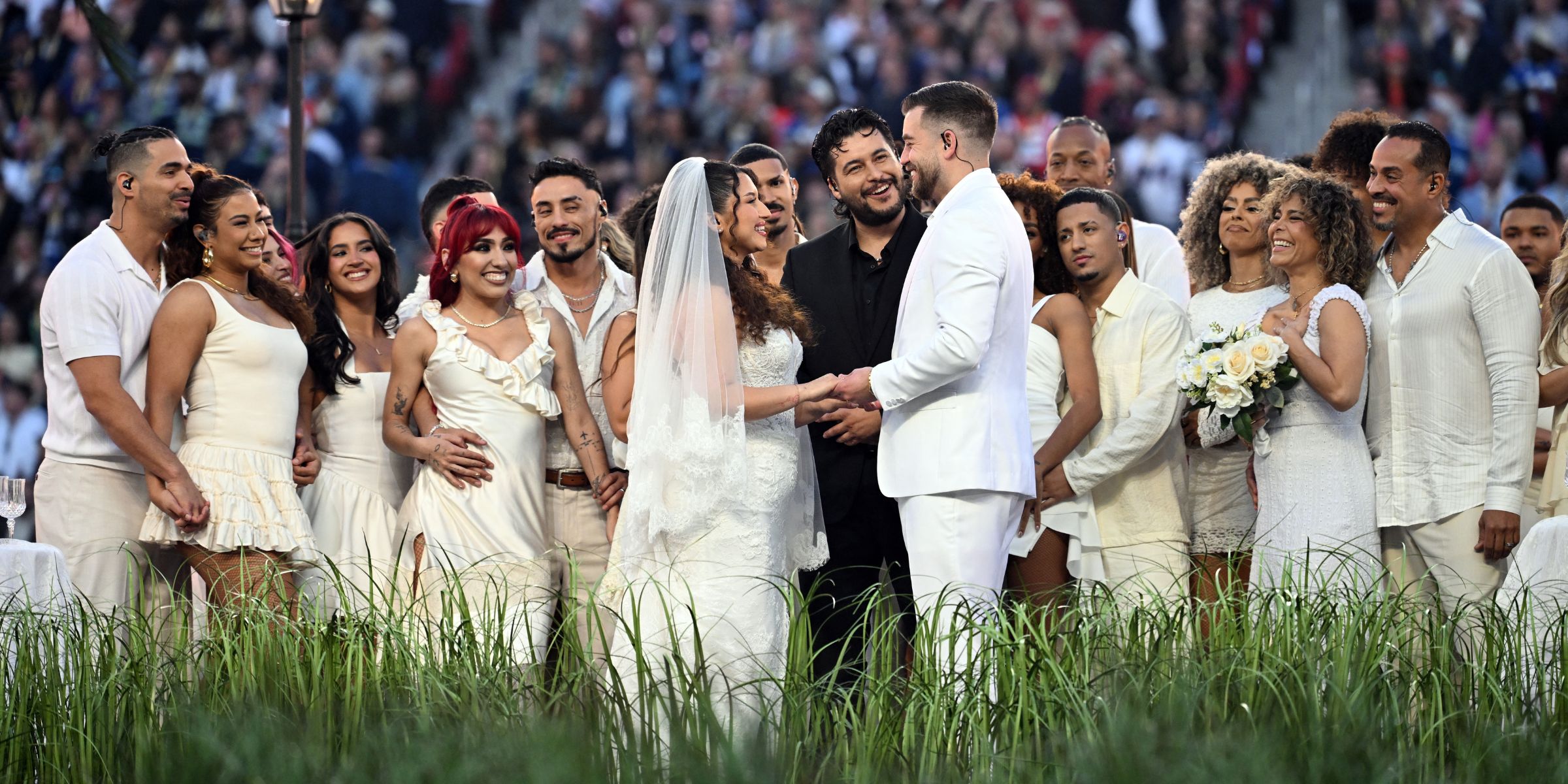 A couple marries during the Bad Bunny performance onstage at the Apple Music Super Bowl LX Halftime Show on February 08, 2026 in Santa Clara, California | Source: Getty Images