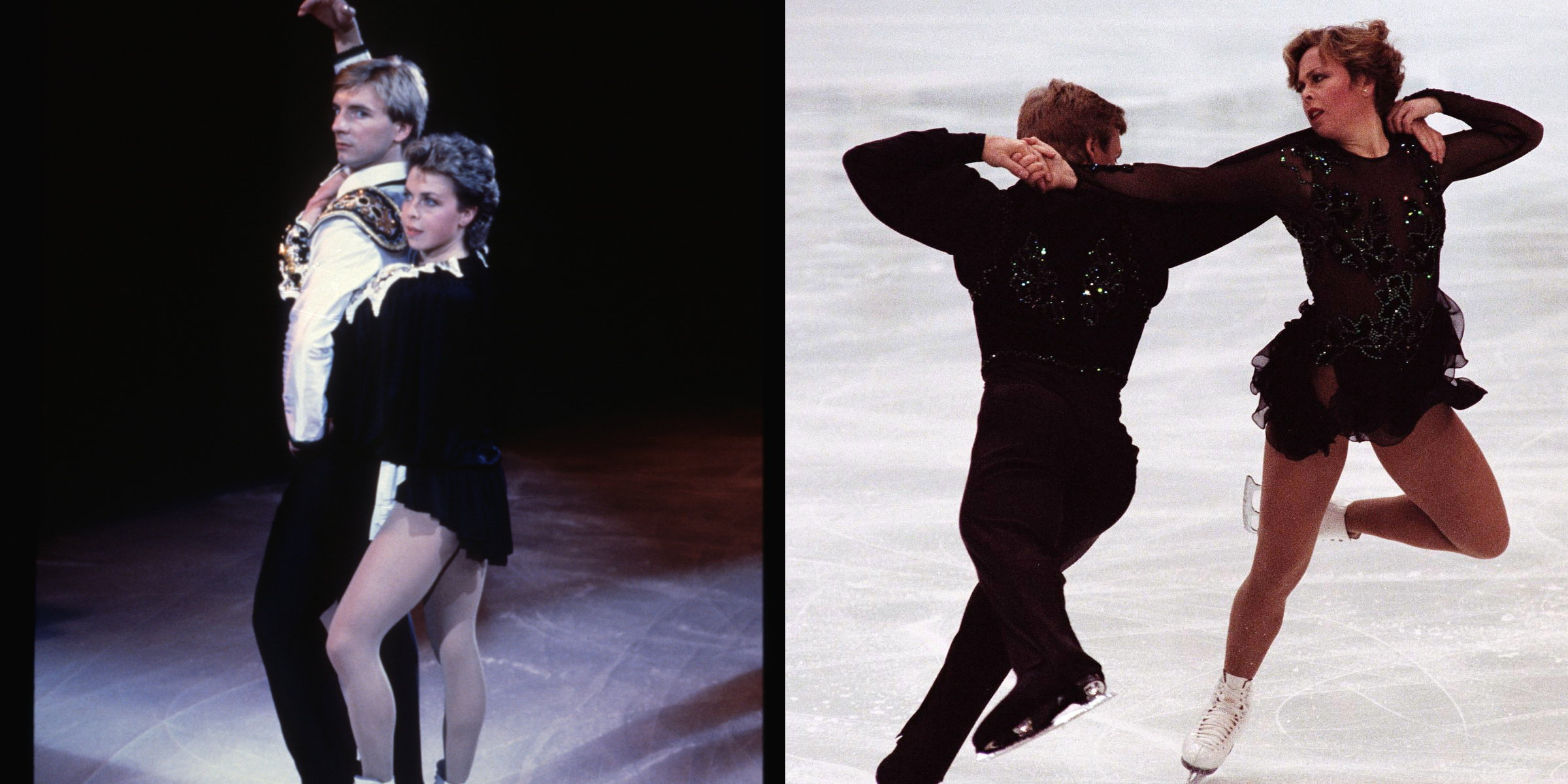 Torvill and Dean hold a poised ballroom-style position during their Olympic-winning era. With arms lifted and hands linked, they glide in elegant synchrony, their lines crisp and controlled.