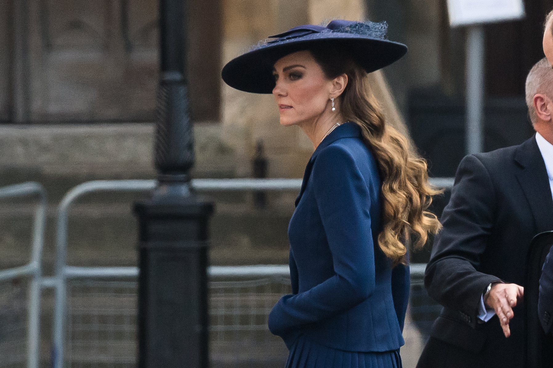 The Princess of Wales arrived alongside her husband, Prince William, wearing a coordinated navy blue ensemble. Kate wore a coat dress by London-based designer Catherine Walker — a label she has frequently chosen for major royal occasions.