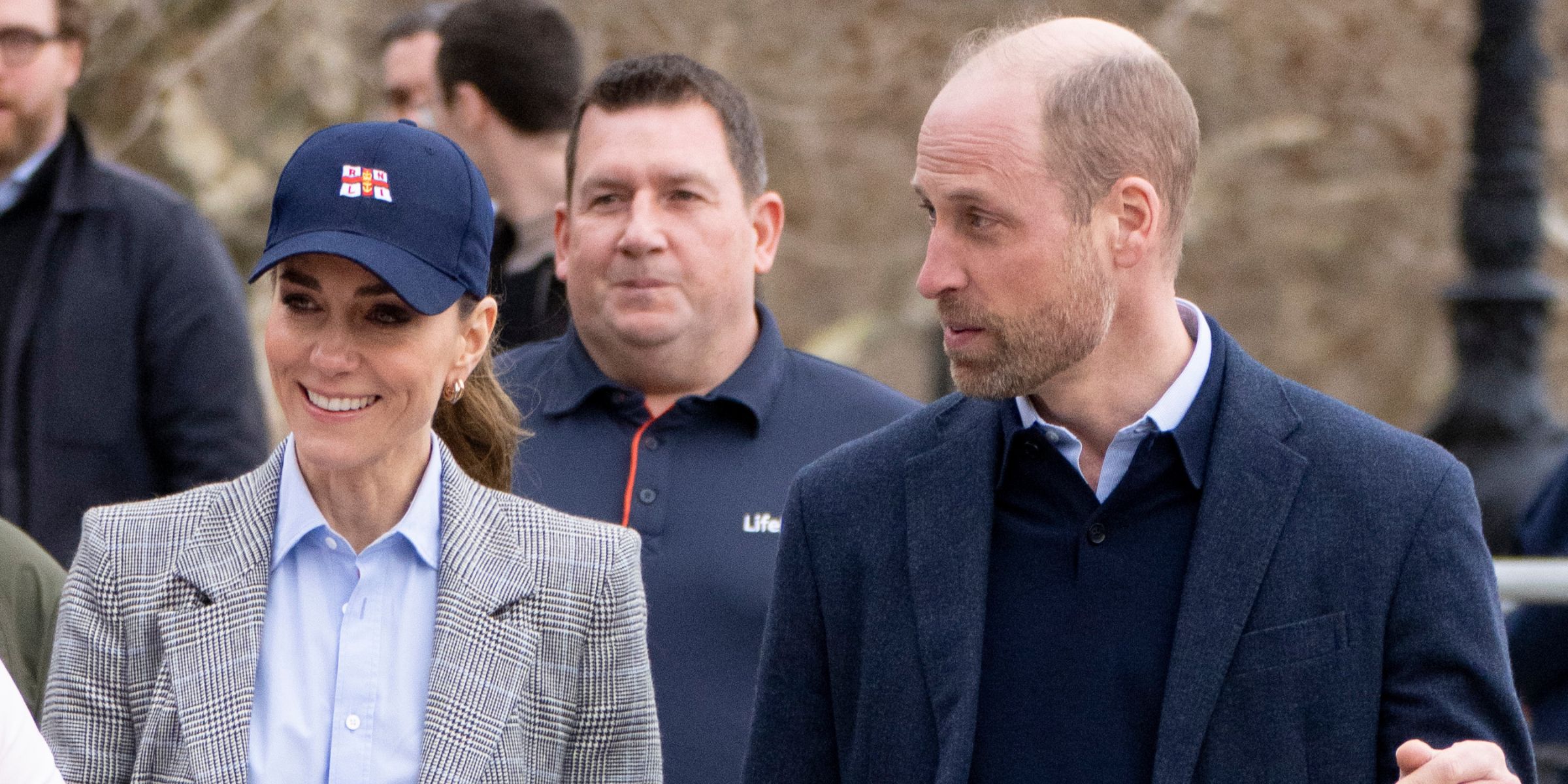 William, equally relaxed, wore a navy blue crewneck jumper layered under a matching navy blazer, paired with dark trousers and rich brown suede shoes. The pair looked coordinated without trying — and utterly at ease, despite what was unfolding around them.