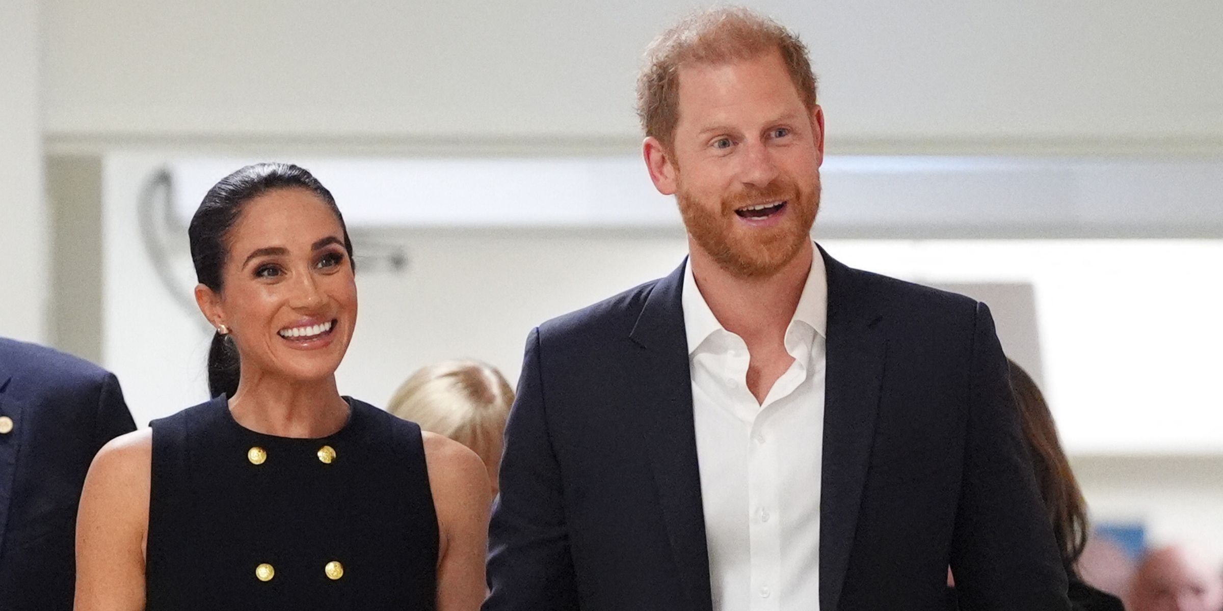 The Duchess of Sussex appeared at ease in a sleeveless black dress with gold button detailing, while the Duke opted for a classic dark suit, the pair frequently seen smiling, waving, and stopping for photos.