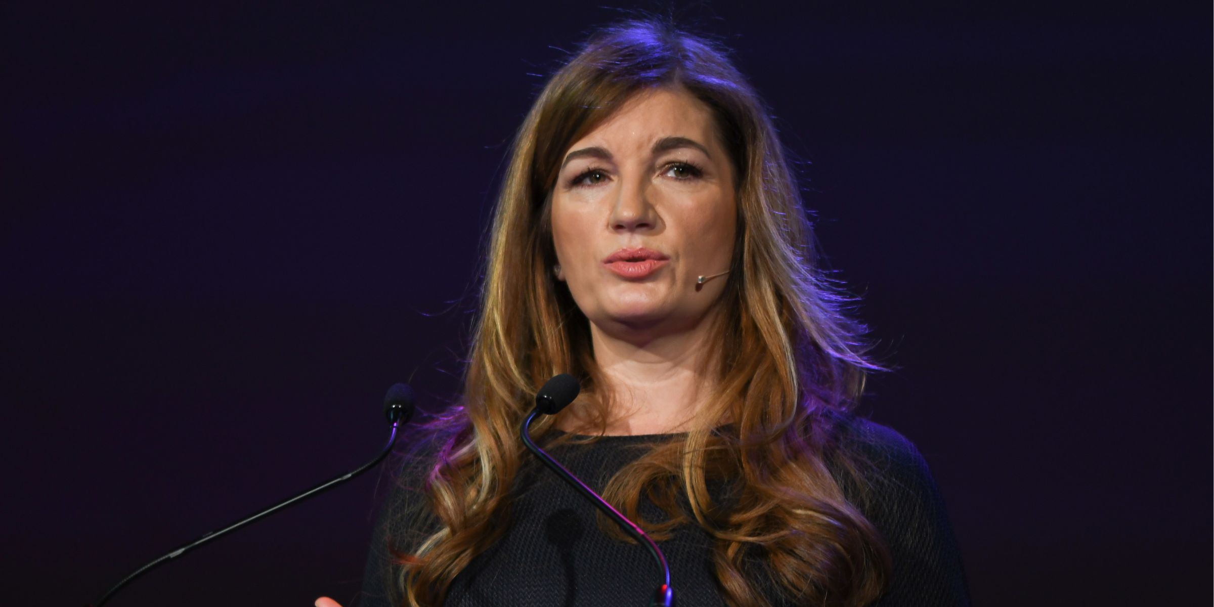 Commanding the Room: Baroness Brady stands tall at the podium during The Players’ Project launch on 7 November 2018, addressing the media from London Stadium. Wearing a patterned blue dress and glasses, she exudes gravitas and grace, as she outlines a vision to inspire change through sport.